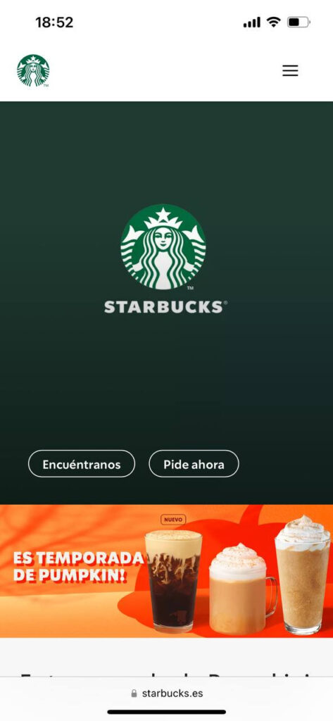 La característica que define al diseño web responsive es que el contenido y los elementos gráficos permanecen iguales. Por ejemplo, las versiones de escritorio y móvil de Starbucks son muy similares entre sí (incluyendo CTA, botones, textos e imágenes).